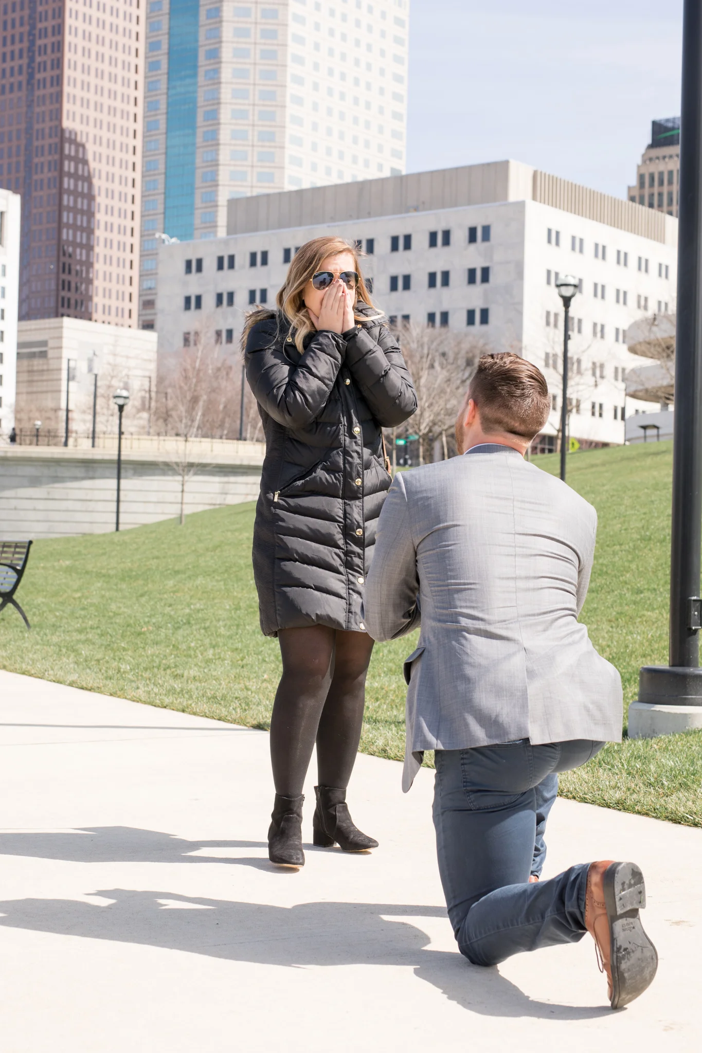 Fast-forward to April 1st 2018; Zak and I have been together for nearly four years, both graduated college with honors and have careers we love. After church with both of our family's, we headed to brunch at my favorite spot with views of the Columbus skyline and the Scioto River. My mom asked to get a picture of my sister and I down by the water, so we walked down the hill when everyone stopped walking and Zak went ahead of the group. When we got to the water, Zak said "Remember what I did to you four years ago? I hope this makes up for it." He got down on one knee and asked if I'd be with him forever. Needless to say had I forgave him since then, and I said YES!"